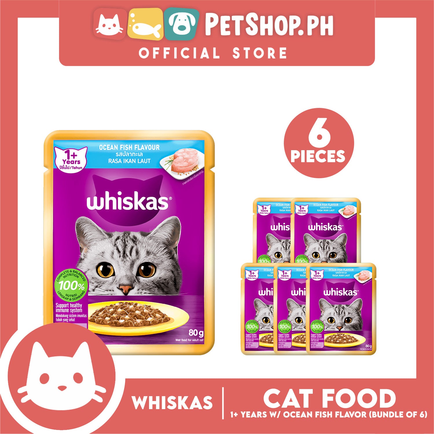 6pcs Whiskas Ocean Fish Pouch Wet Cat Food 80g