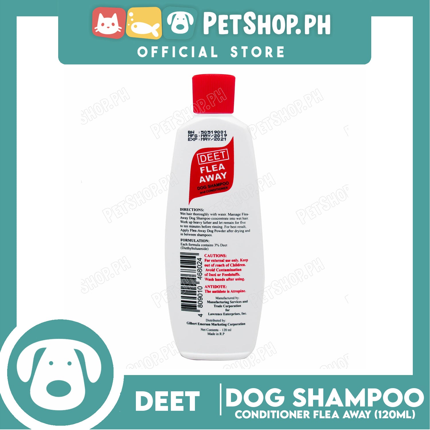 Directions: Wet hair thoroughly with water. Massage Flea Away Dog Shampoo concentrate into wet hair. Work up heavy lather and let remain for 5-10 minutes before rinsing. For best result, Apply Flea Away Dog Powder after drying and in between shampoos.