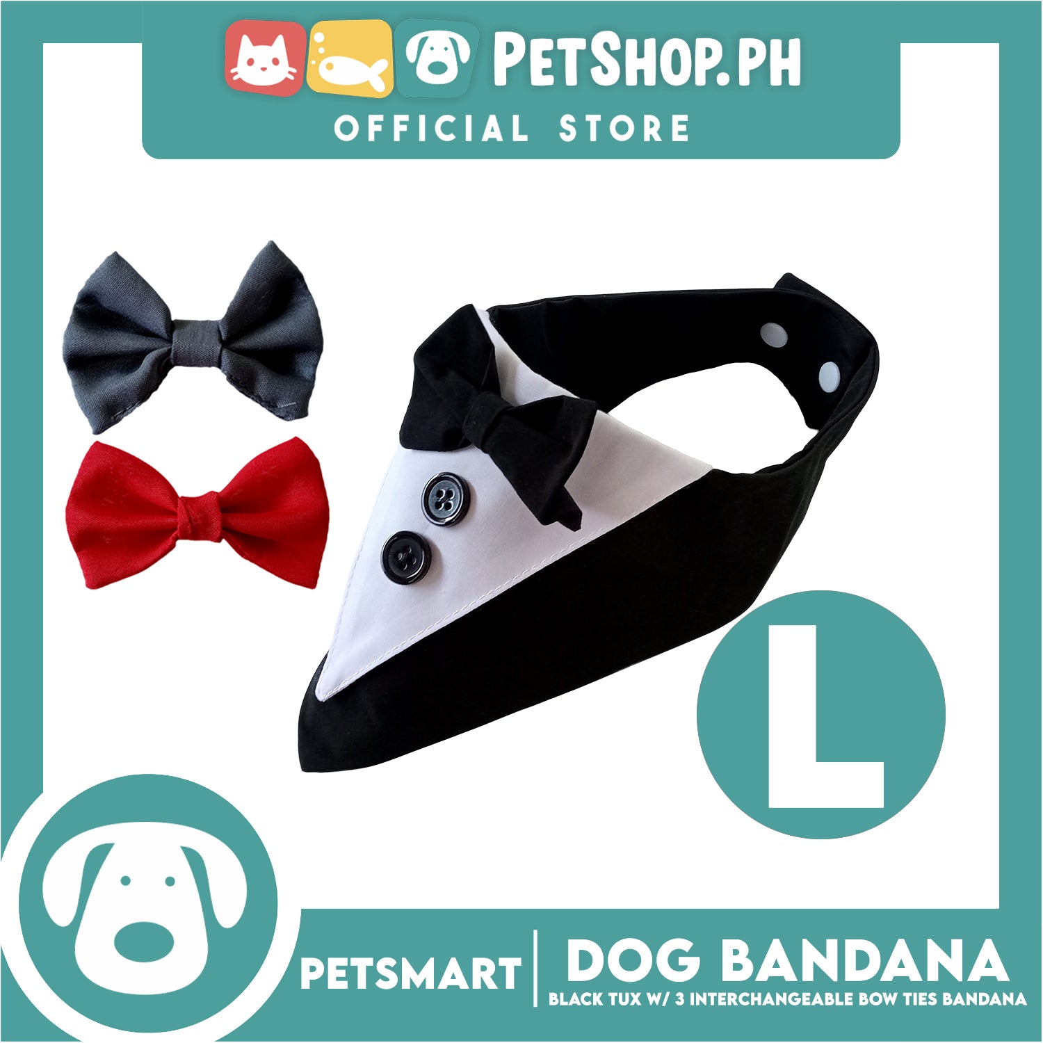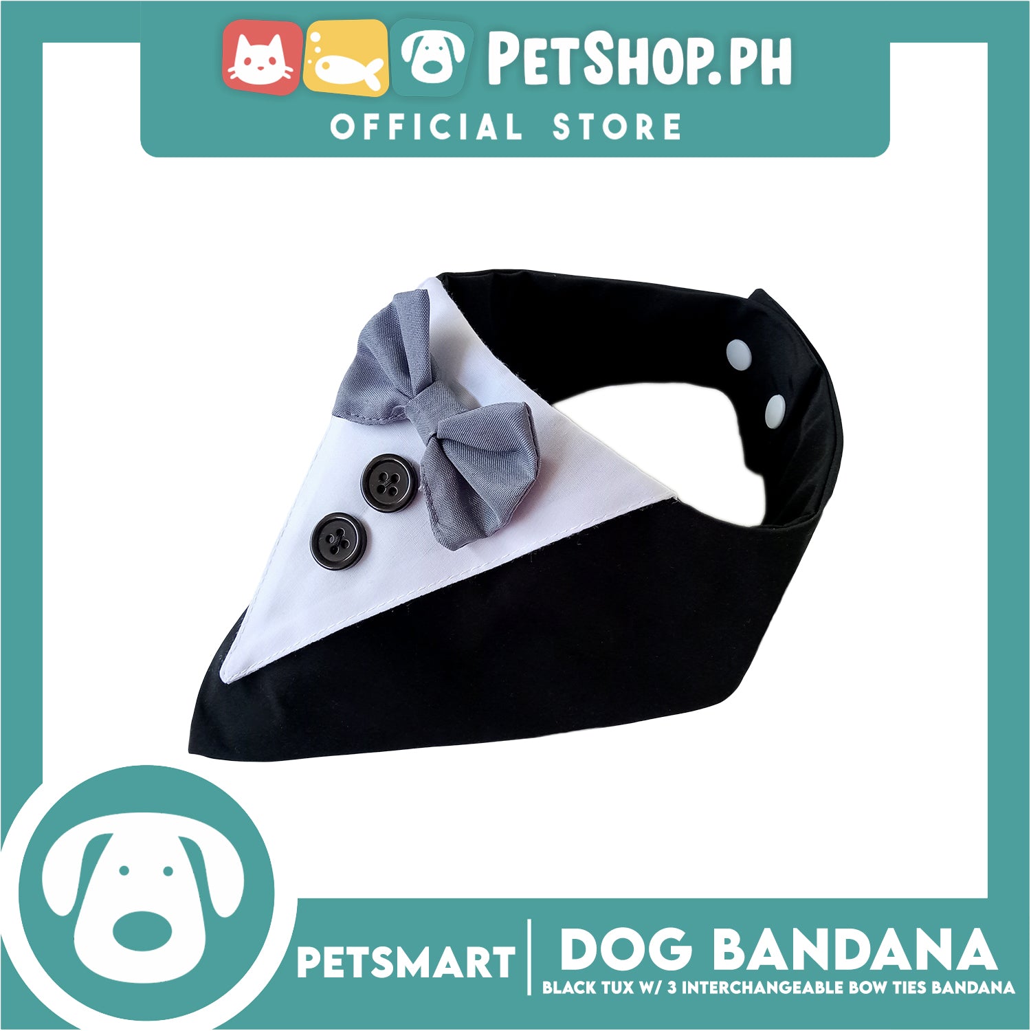 Dog Bandana, Black Tuxedo with 3 Interchangeable Bow Ties DB-CTN45L (Large) Soft and Comfortable Pet Bandana