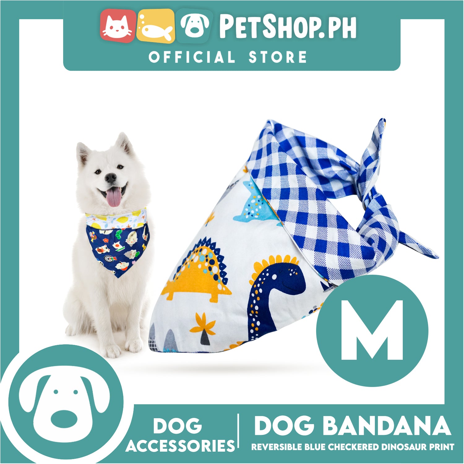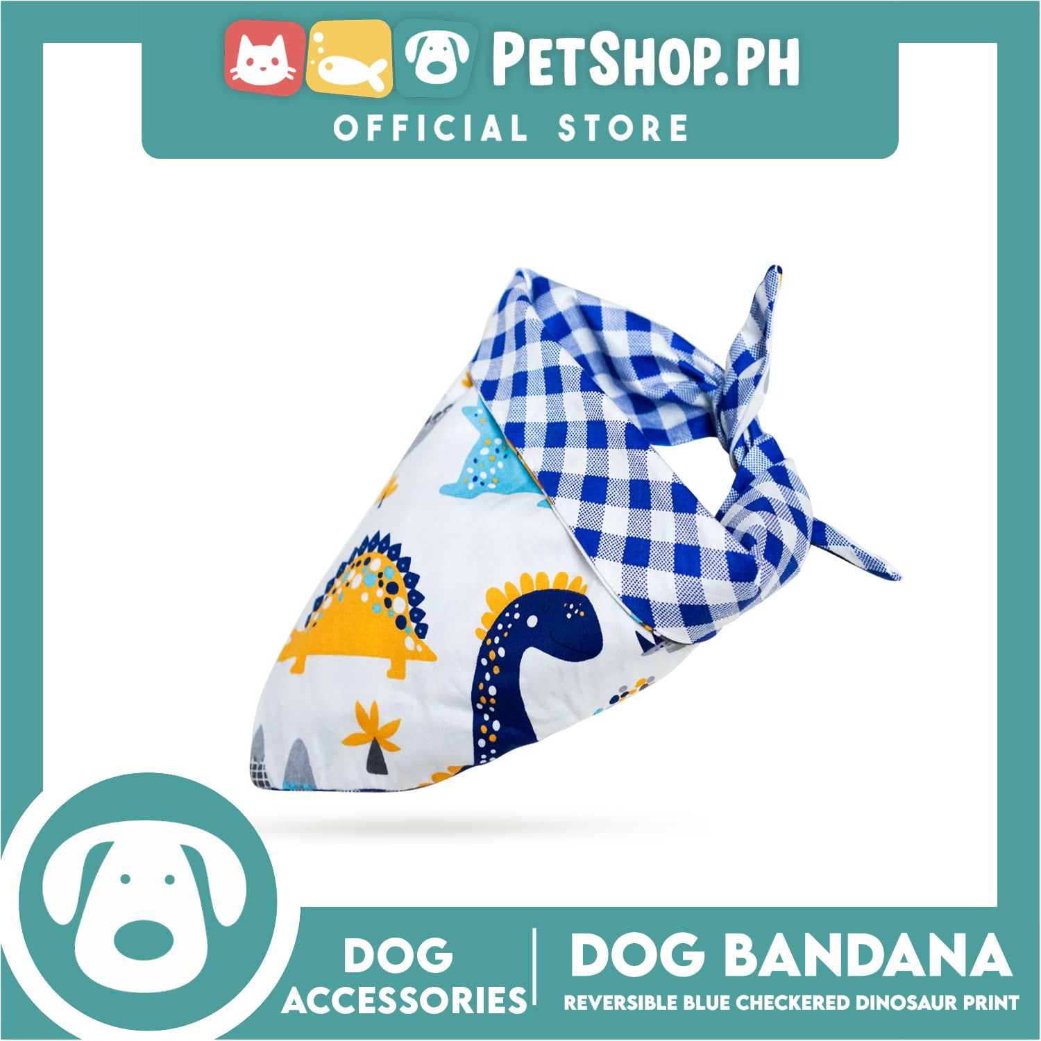 Dog Pet Bandana (Medium) Reversible Blue Checkered Dinosaur Print Washable Scarf