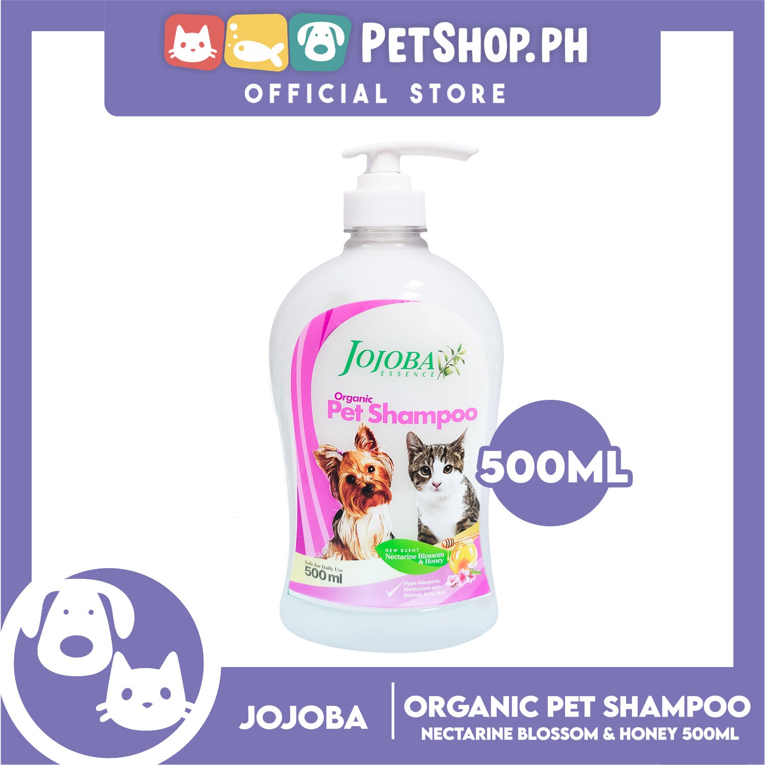 Jojoba Essence Organic Pet Shampoo 500ml (Nectarin Blossom And Honey) Safe For Daily Use For Your Cats And Dogs