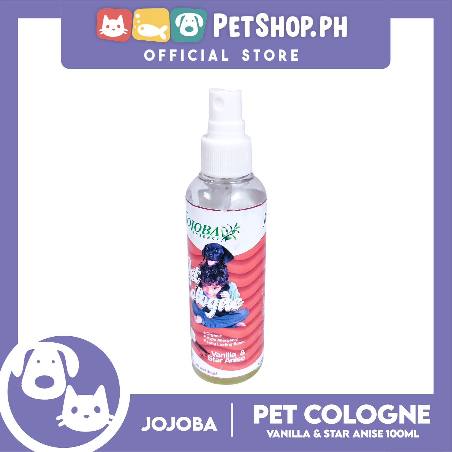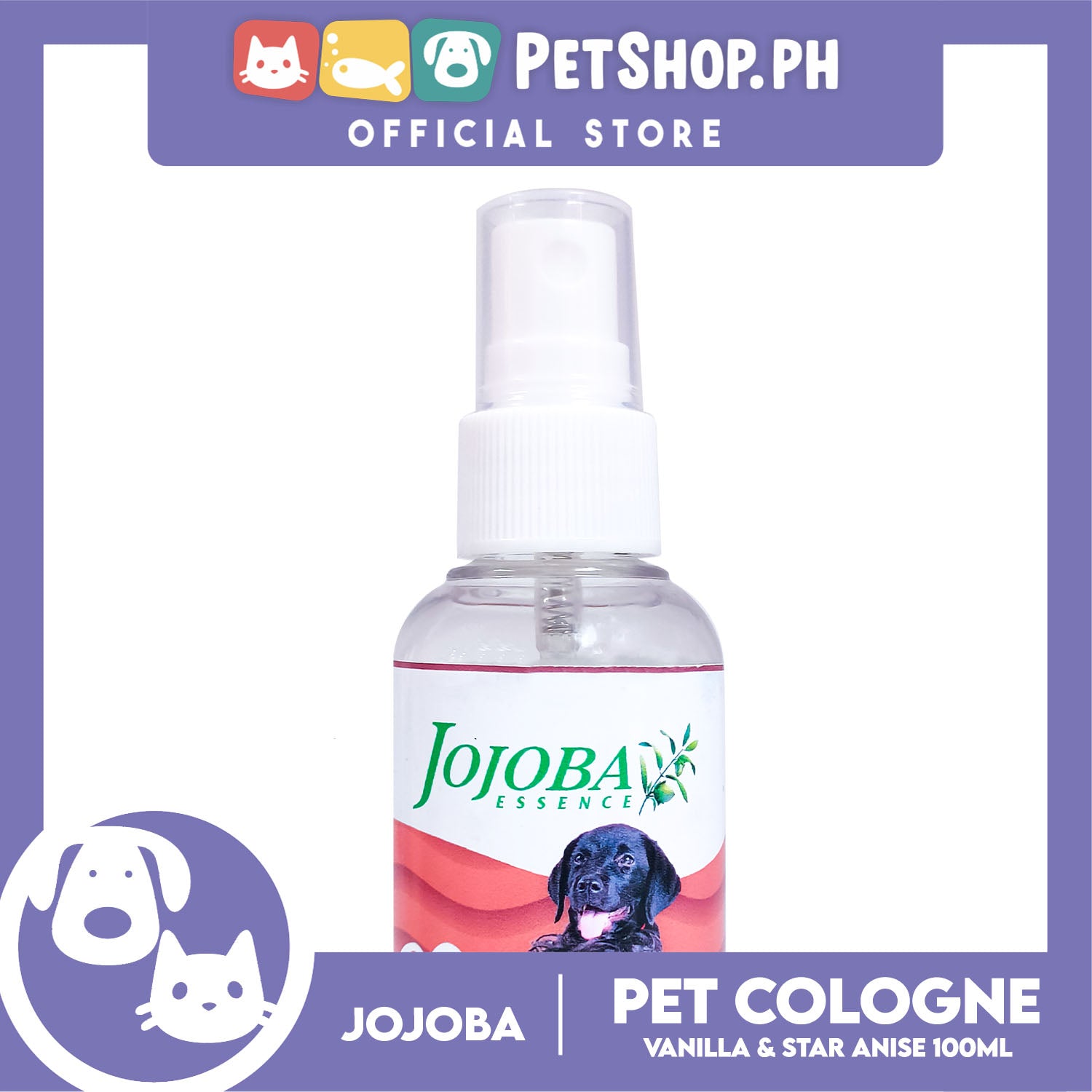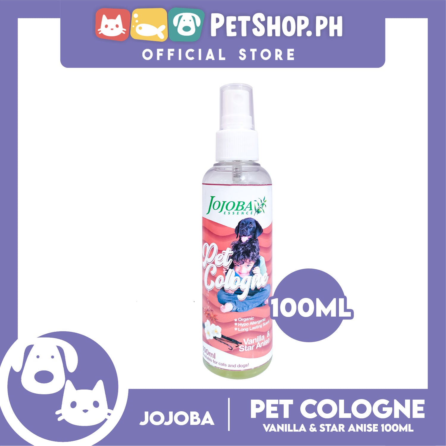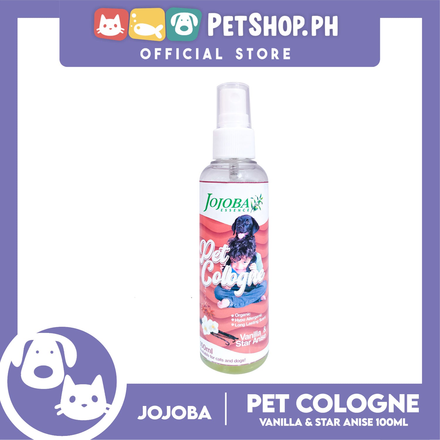 Jojoba Essence Pet Cologne Spray 100ml (Vanilla And Star Anise Scent) Organic, Hypo Allergenic, Long Lasting Scent, Pet Cologne For Cats And Dogs