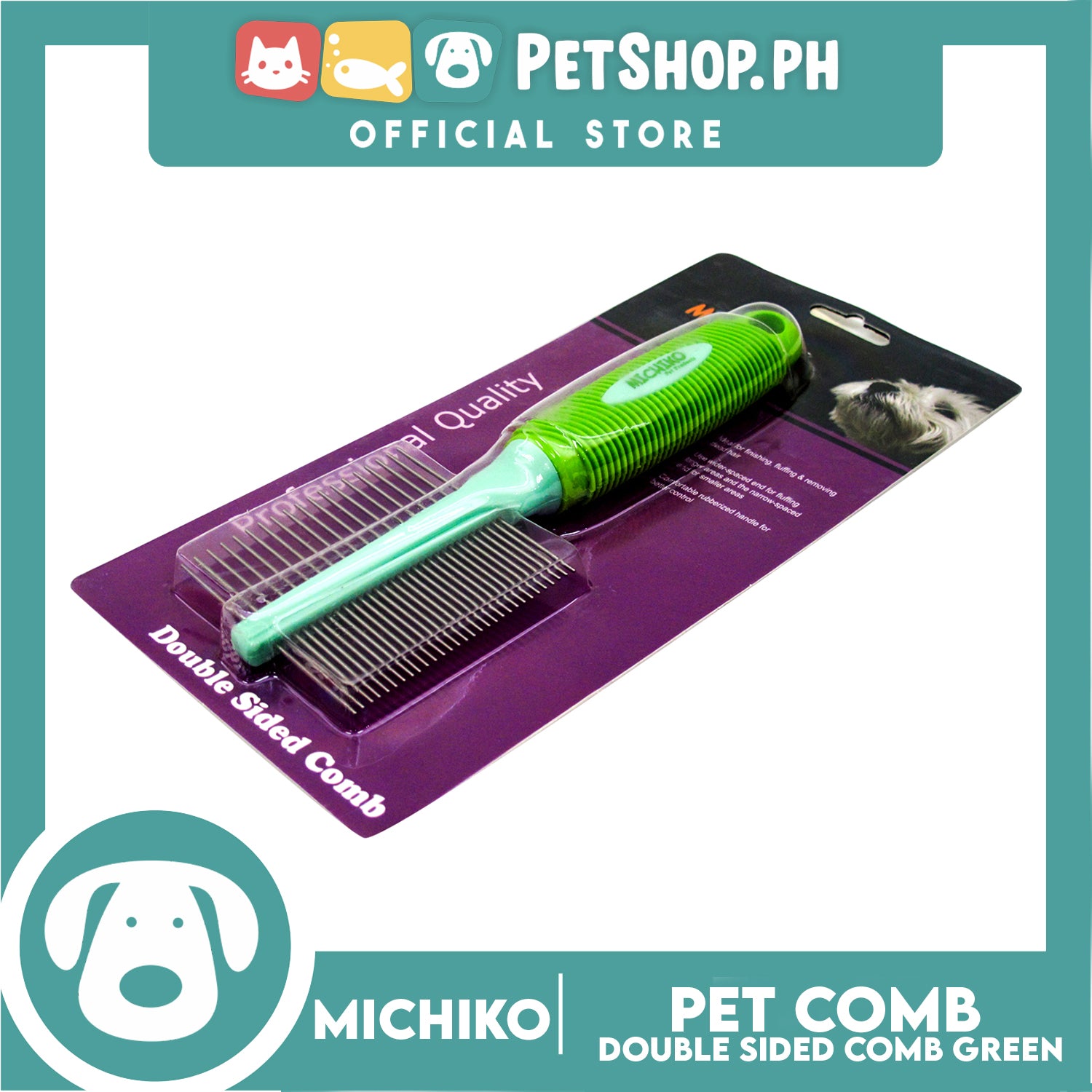 - The michiko double sided pet comb has a comfortable rubberized handle for better control.