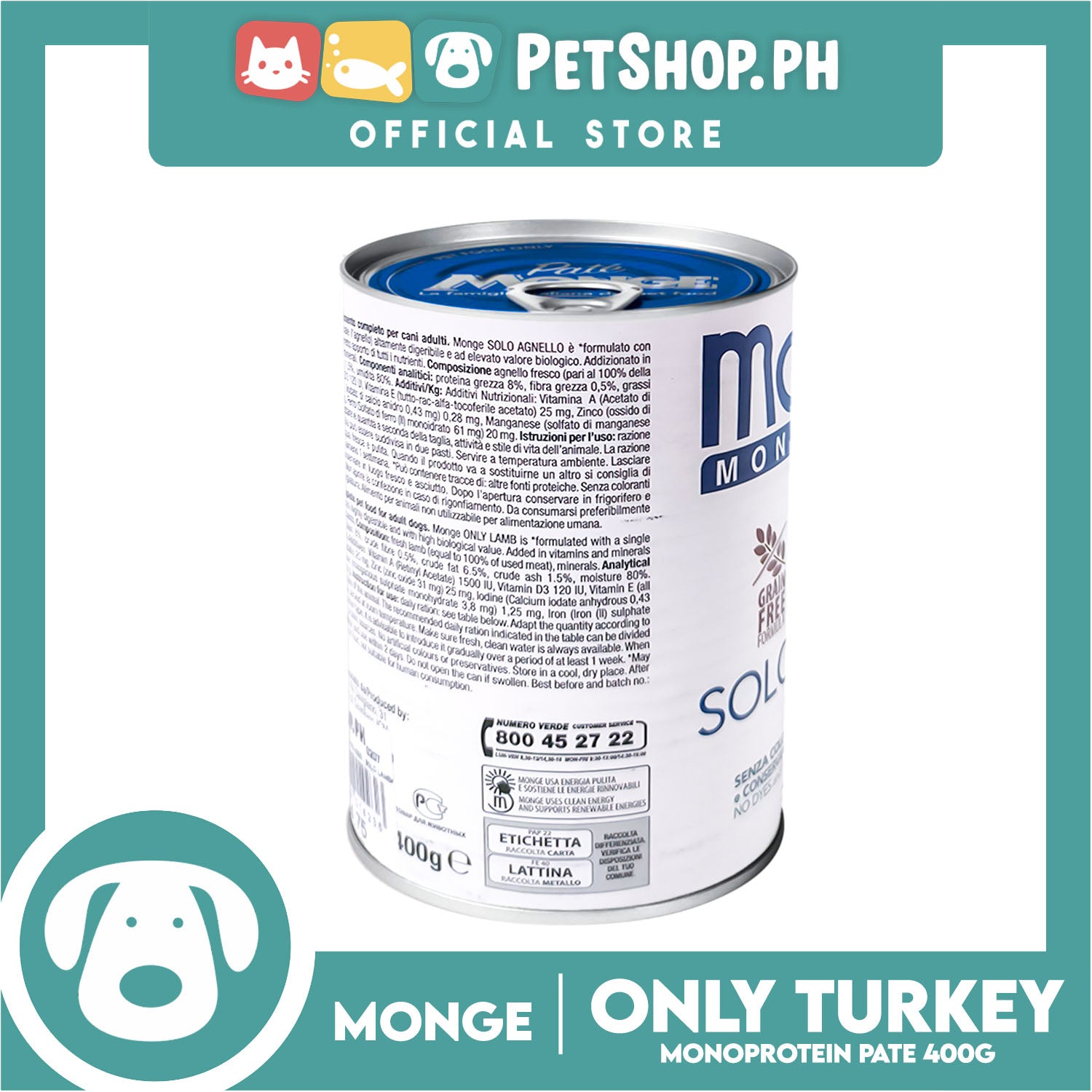 Monge Monoprotein Solo Pate Wet Dog Food, Grain Free 400g (Solo Tachinno, Only Turkey) For Daily Diet Of All Breeds Puppies Canned Food