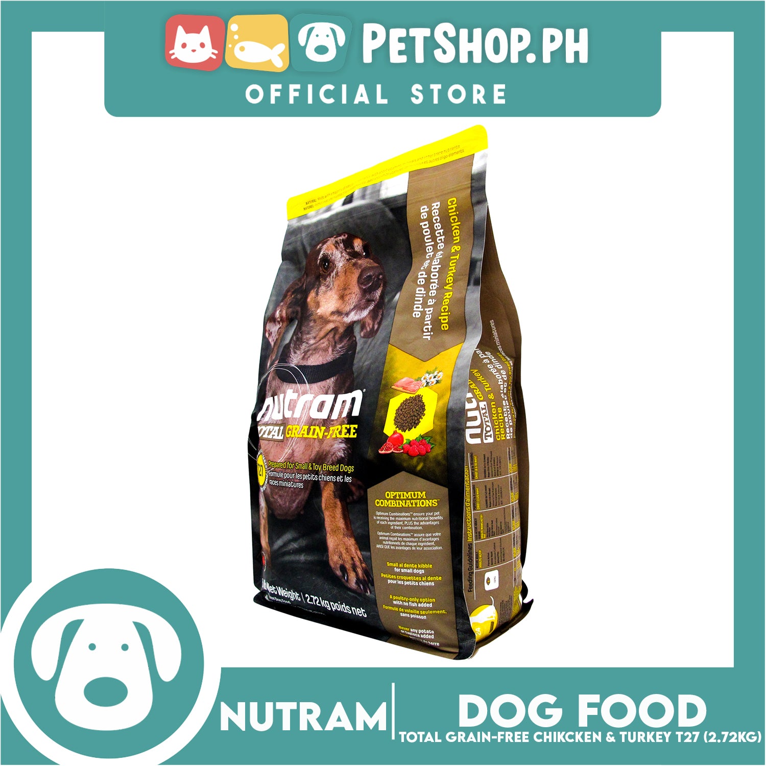 T27 Nutram Total Grain-Free® Chicken & Turkey Dog Food for Small and Toy Breed Dogs is a Holistic, multi-beneficial, and nutrient-rich recipe that improves your pet’s wellness from the inside-out. Our Holistic approach starts with wholesome ingredients you can pronounce, such as a blend of low-glycemic Lentils, Peas and Chickpeas as a source of healthy carbs and quality protein. This combined with Pomegranates and Raspberries, rich sources of powerful anti-oxidants, help boost the immune system of small dogs. Nutram's Optimum Combinations™ goes further and offers the calming benefits of Turkey, a source of tryptophan, and Chamomile, with its relaxing properties, which work together to soothe the body. You can be confident that your pet’s food is healing, wholesome and part of a total wellness lifestyle.
