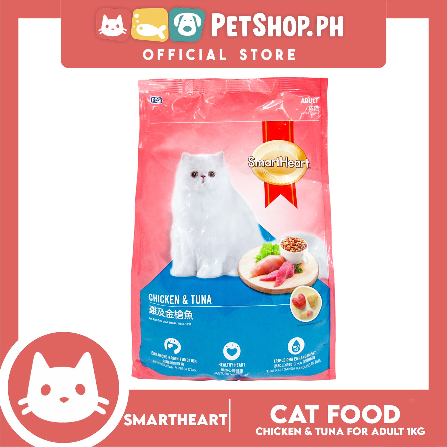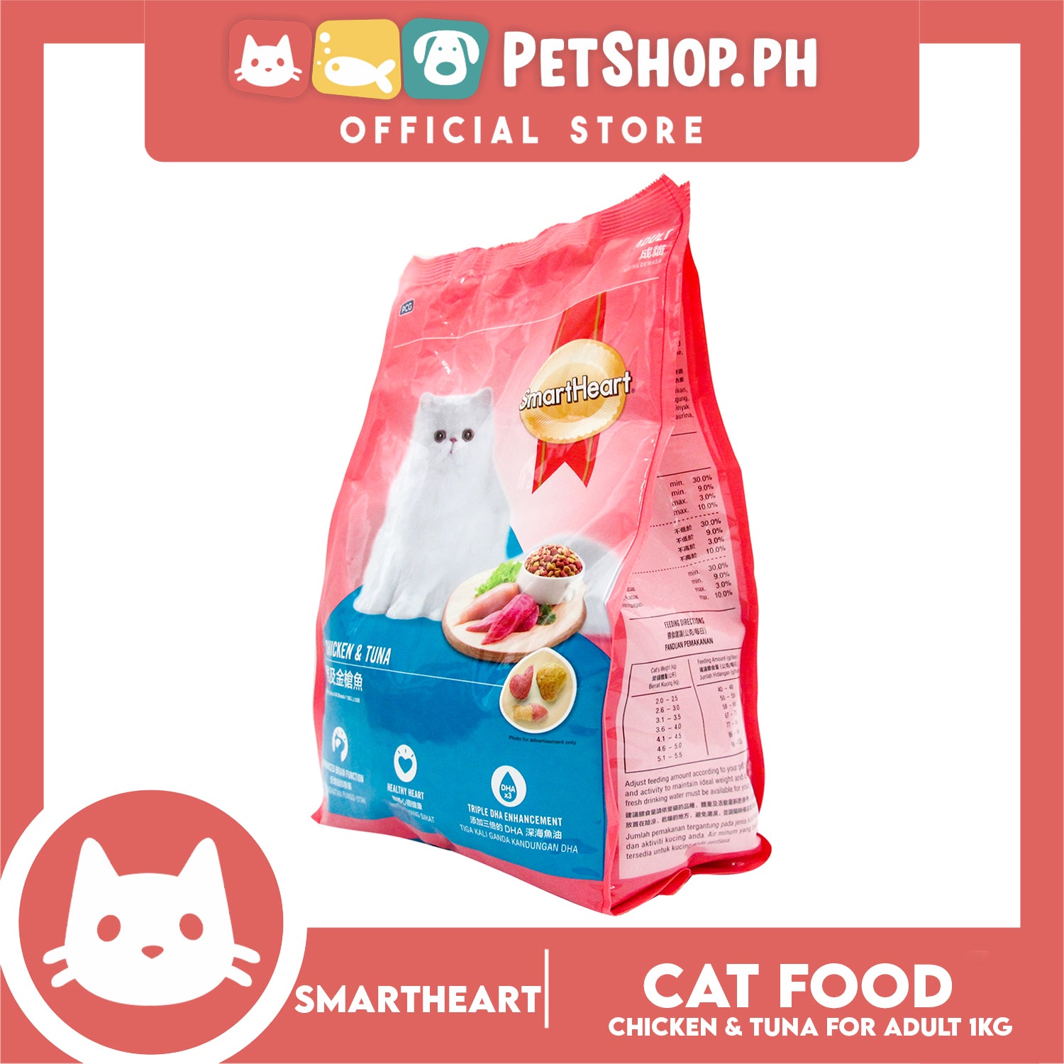 SmartHeart adult cat food is formulated to meet adult cat's requirements using the best quality ingredients and supplemented with fish oil (rich in DHA and Omega-3 fatty acid) and Lecithin (rich in Choline) to help enhance brain and nervous system function and promote heart health.