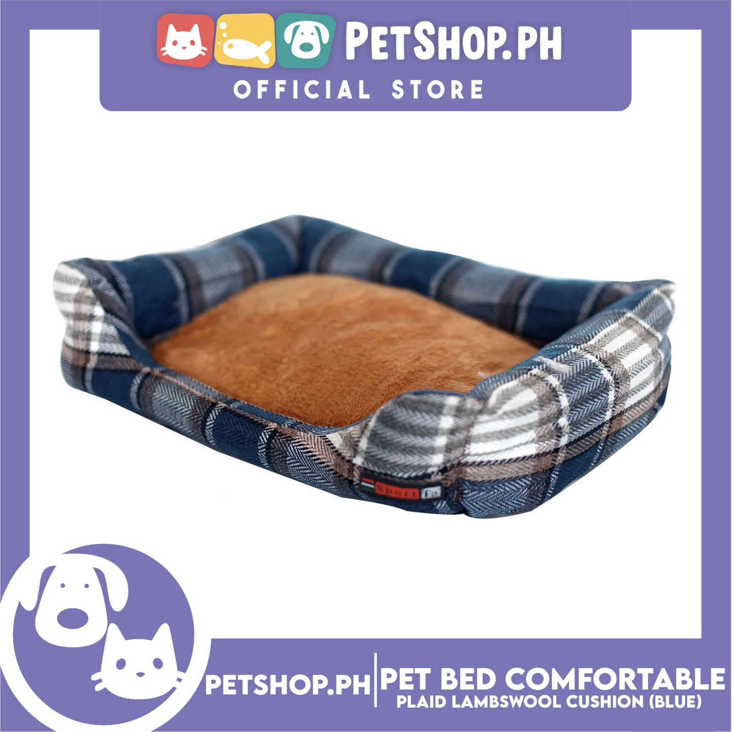 Pet Bed Comfortable Sleeping Bed Plaid Cotton Design with Lambswool Cushion 62x45x12cm Medium (Blue)
