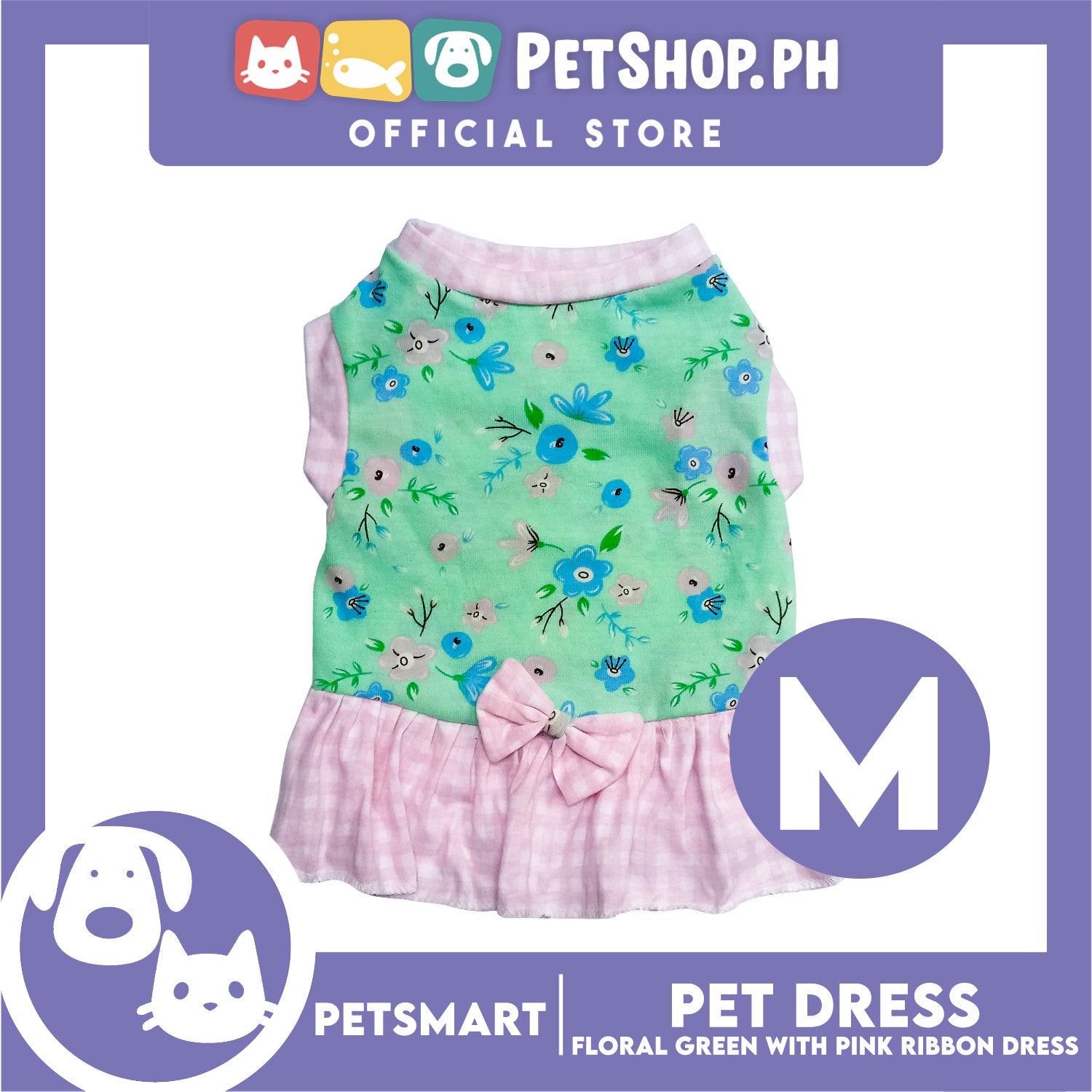 Pet Dress Floral Green with Pink Ribbon Design, Medium Size (DG-CTN212M)