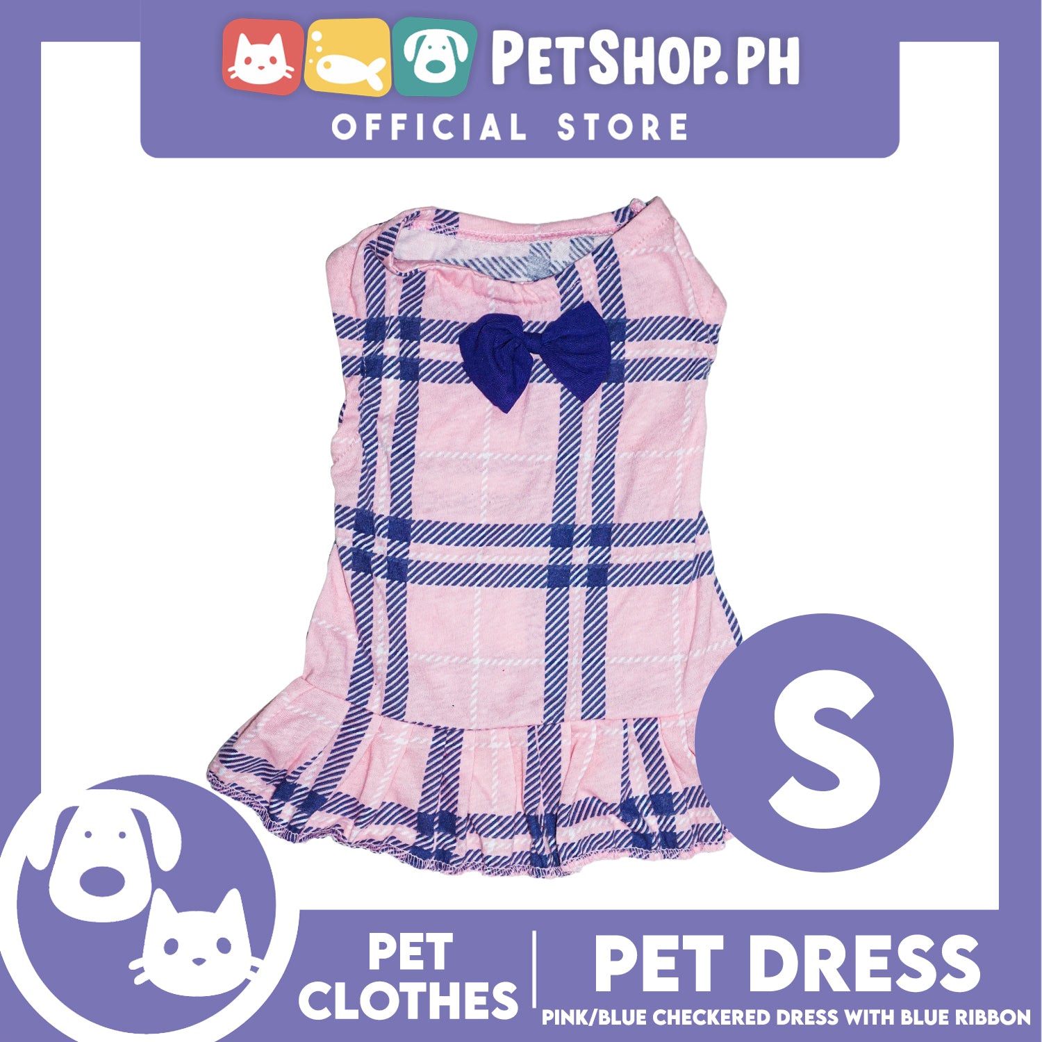 Pet Dress Pink/Blue Checkered Dress with Blue Ribbon (Small) Perfect Fit for Dogs and Cats