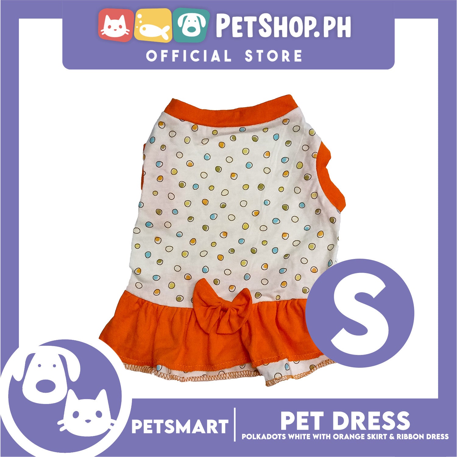Pet Dress Polkadots White with Orange Color Skirt and Ribbon Design, Small Size (DG-CTN200S)