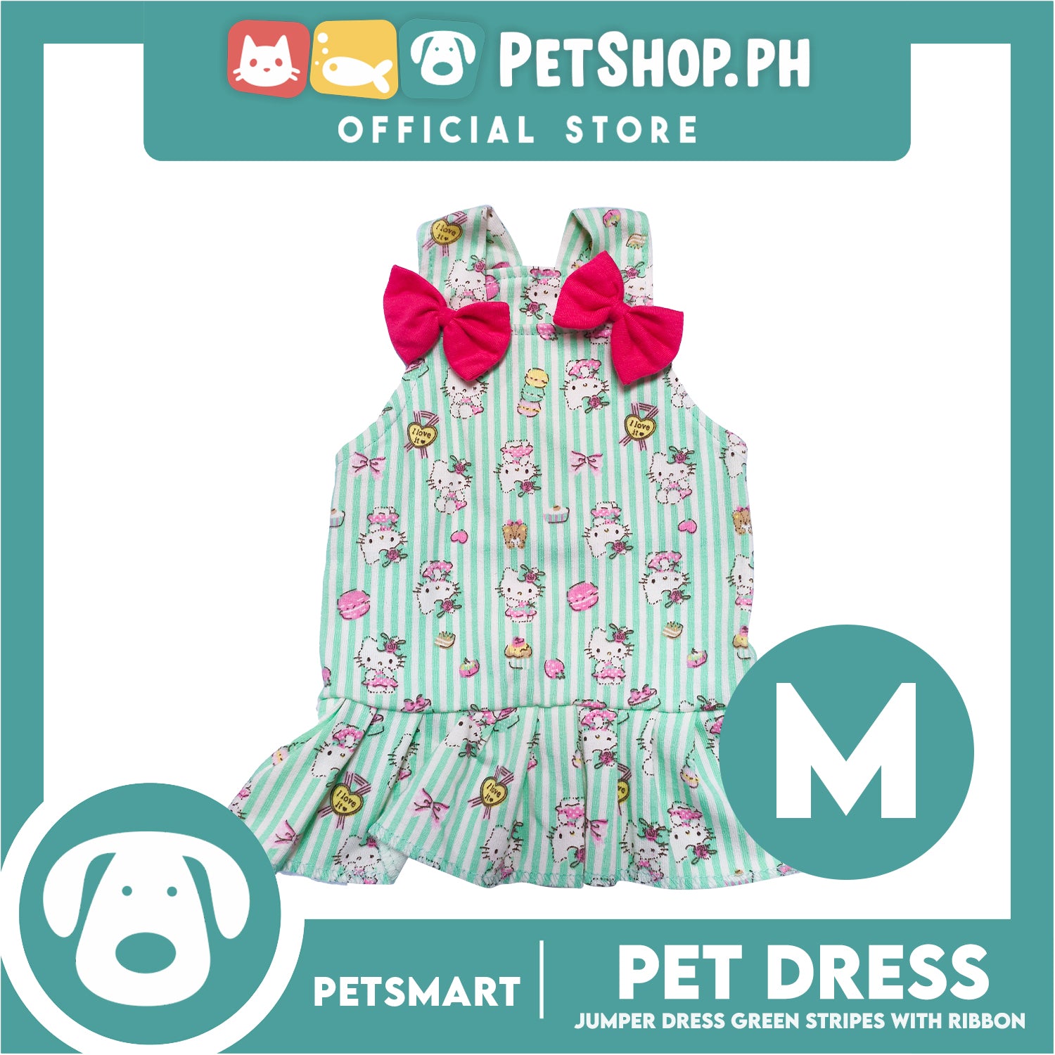 Pet Dress With Character Design, Green Stripes With Pink Ribbon (Medium) Perfect Fit For Dogs And Cats, Breathable Dress, Soft Lightweight Pet Clothing