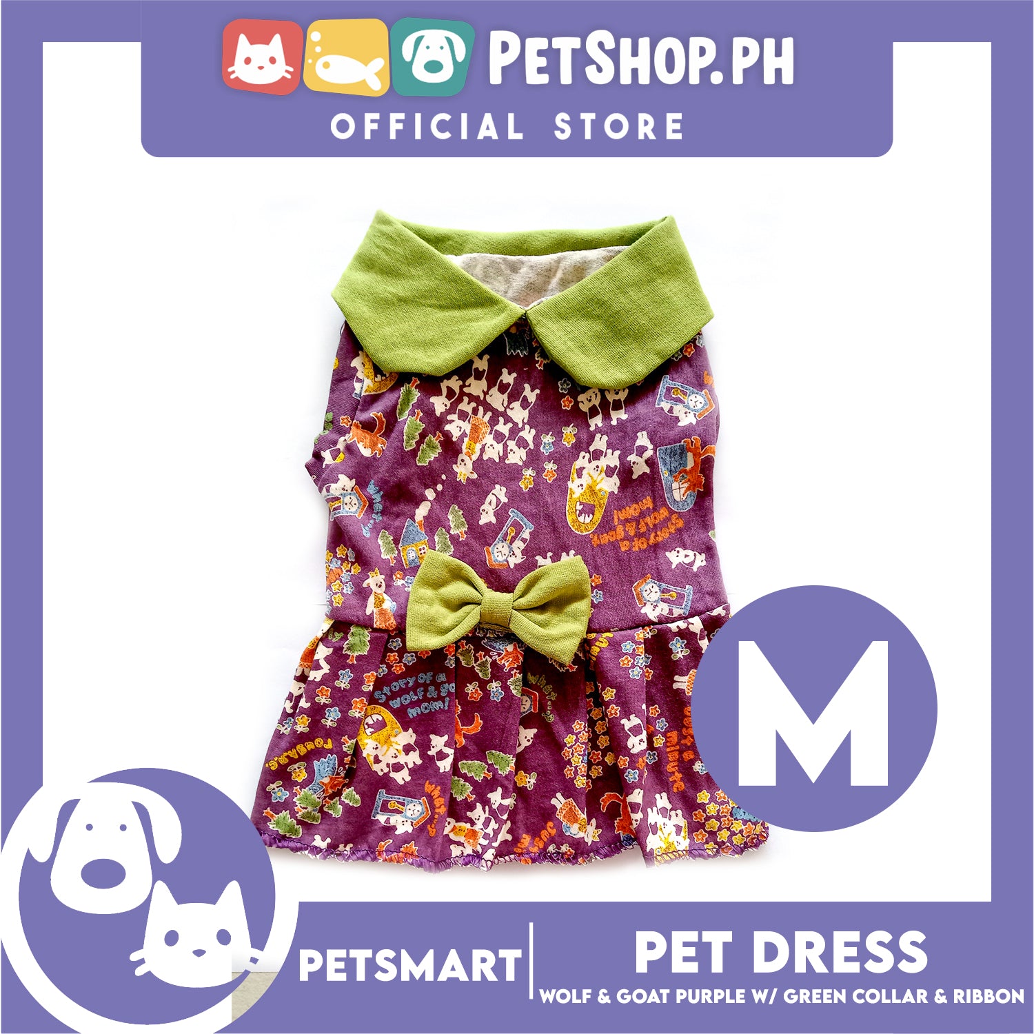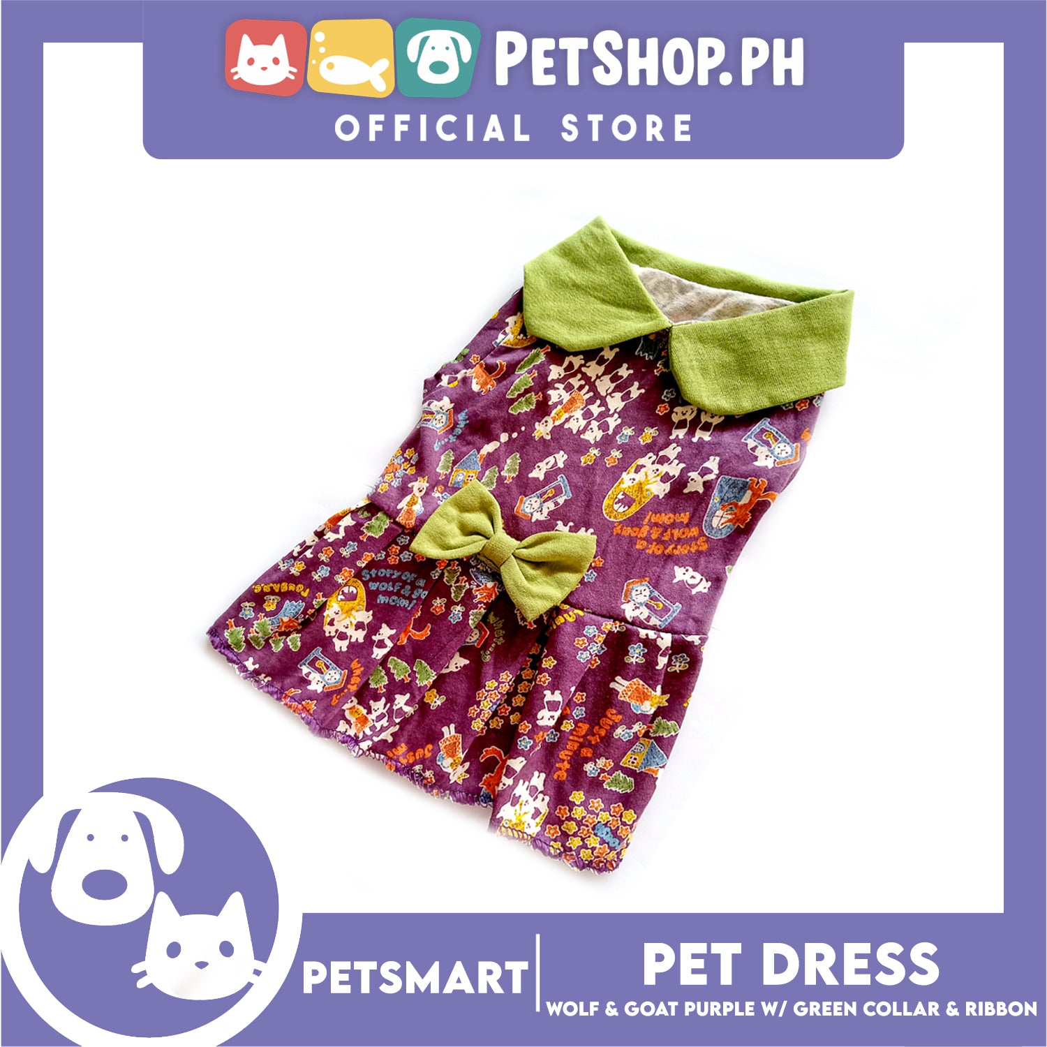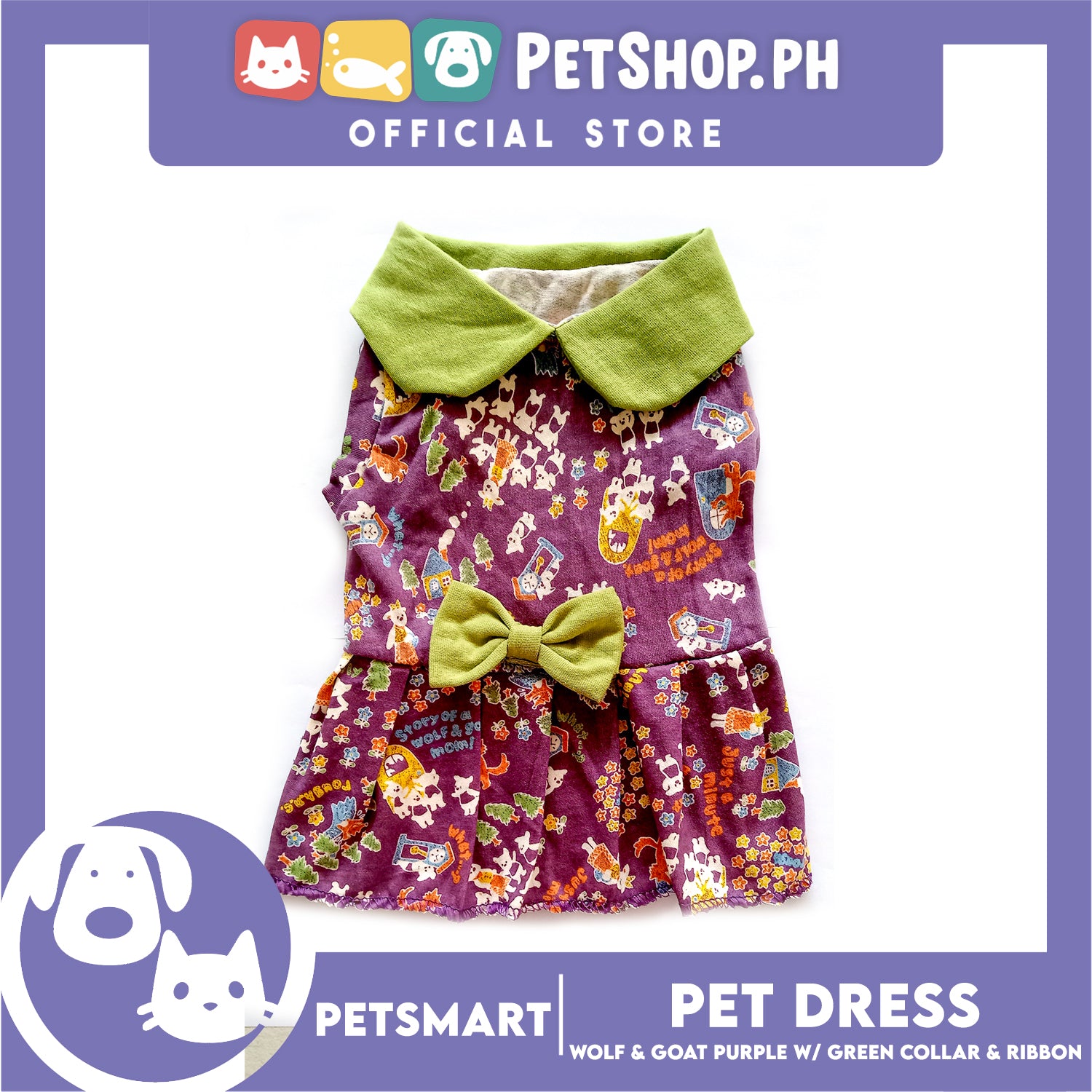 Pet Dress Wolf and Goat Design, Purple with Green Collar and Ribbon Color DG-CTN141M (Medium) Perfect Fit For Dogs And Cats