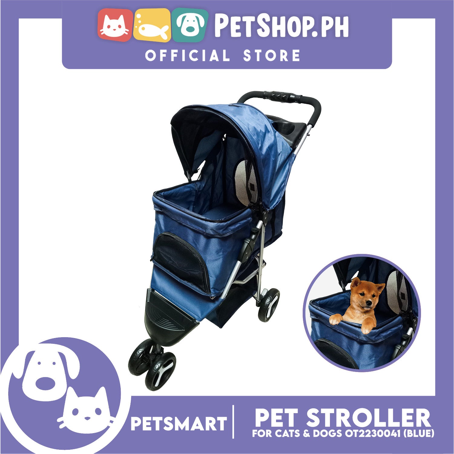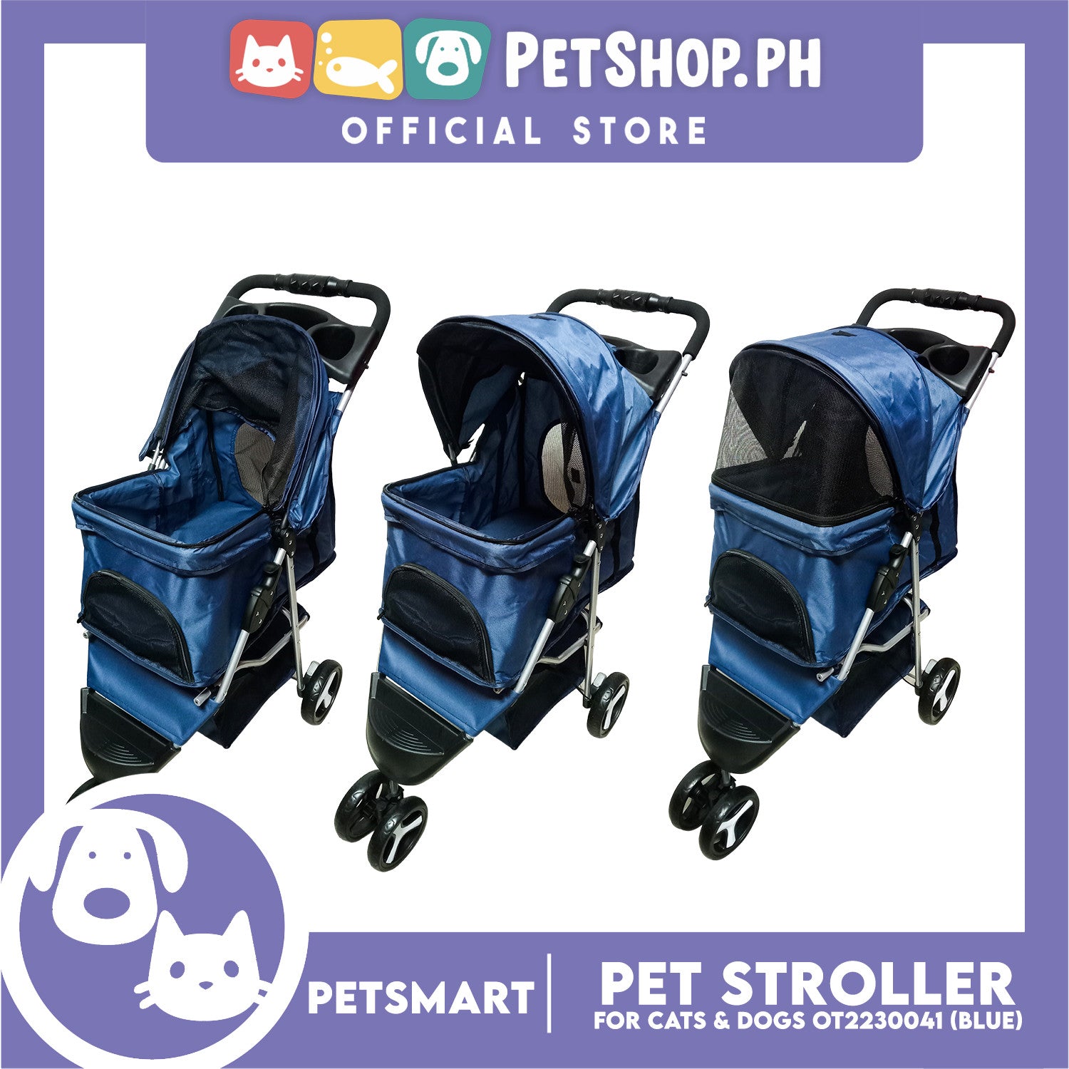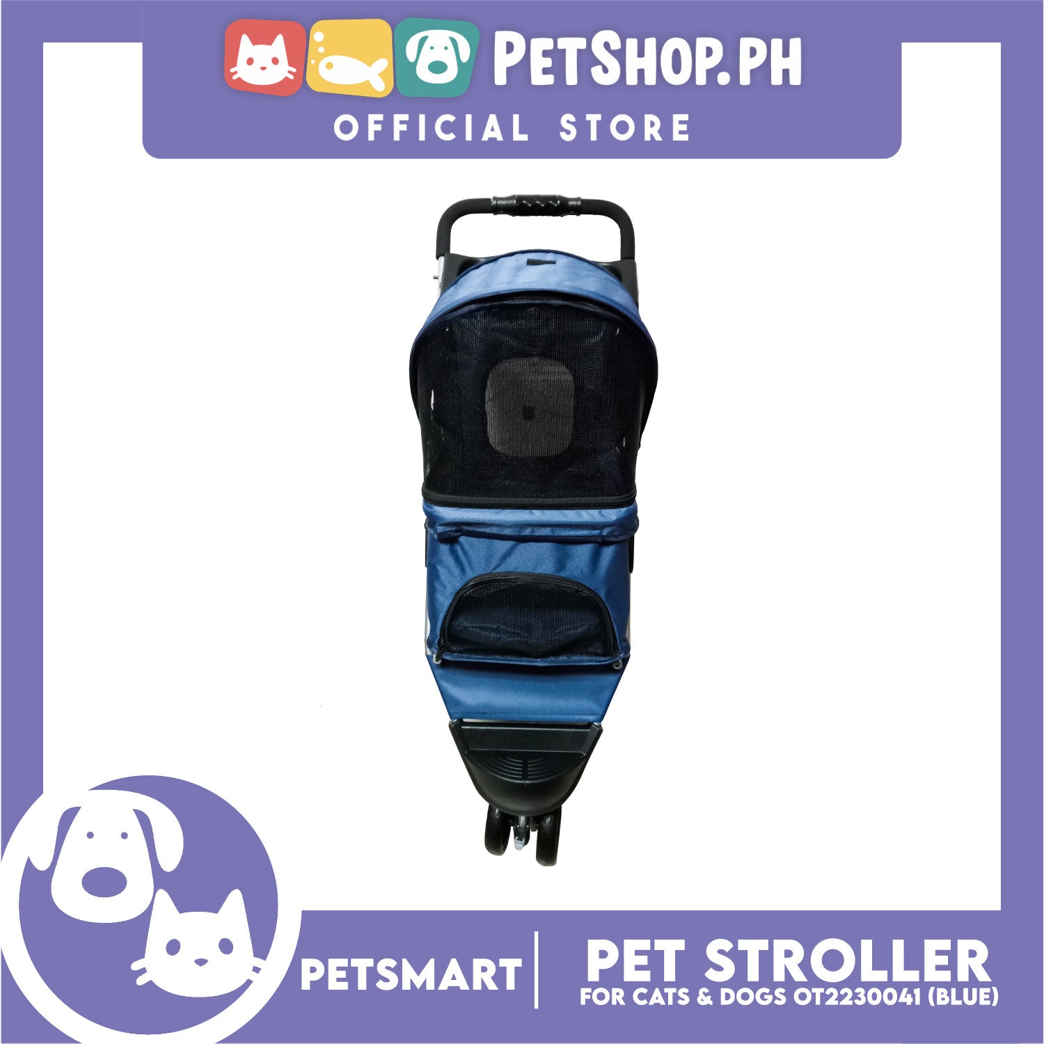 Pet Stroller 3 Wheels for Cats and Dogs, Blue Color (OT2230041) 36cm x 73cm x 105cm