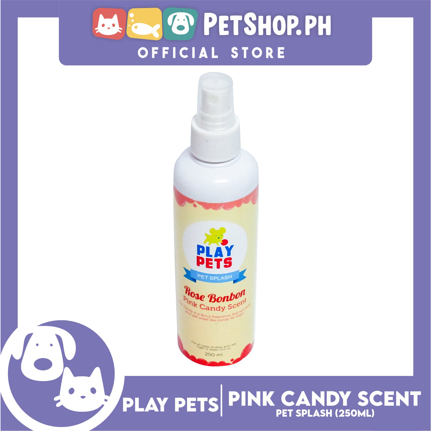 Play Pets, Pet Splash (Pink Candy Scent) Pet Cologne 250ml For All Types Of Dogs And Cats
