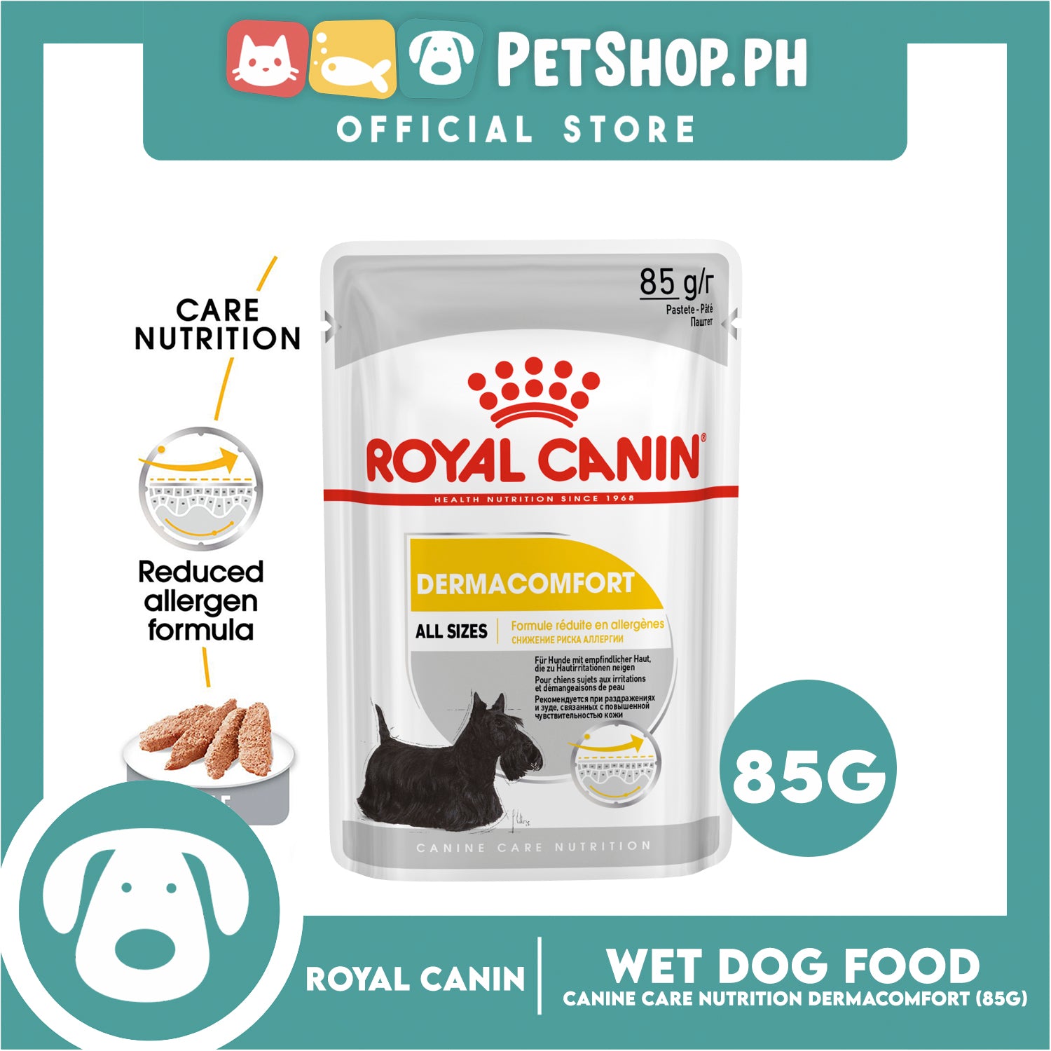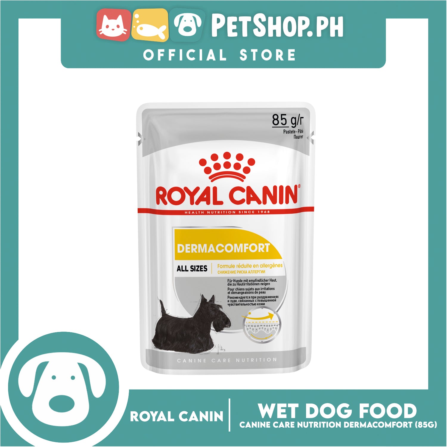 - ROYAL CANIN® Dermacomfort Loaf wet food is specially formulated for adult dogs of all breeds and sizes, over 10 months old. This food contains high quality protein from carefully selected sources. To make it easier for your dog's gastro-intestinal tract to absorb the protein, we make sure that it is highly digestible for optimal results in nourishing your dog's skin.