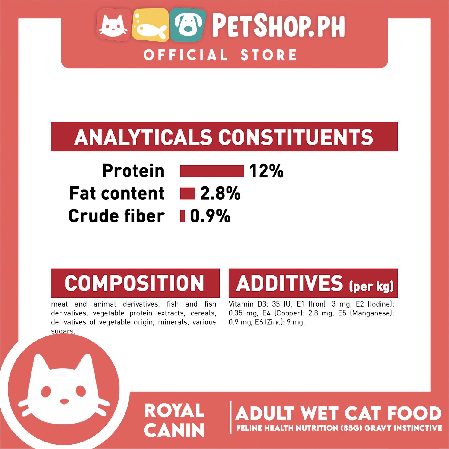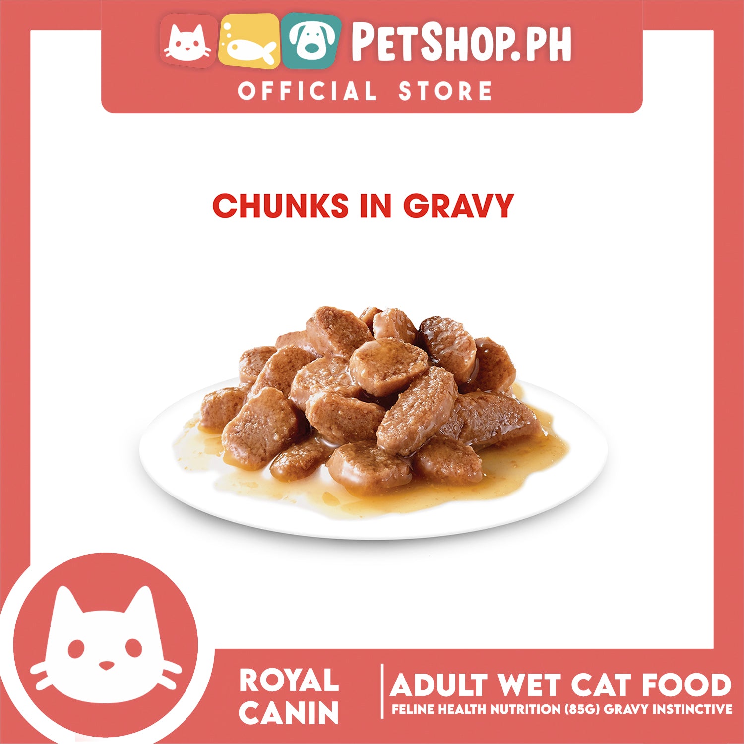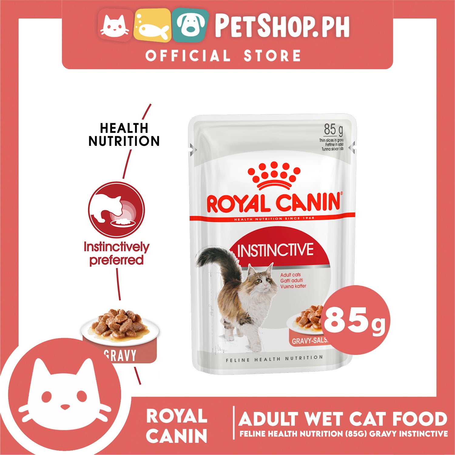 - When feeding your cat, it is possible to align what it actually wants to eat with what it needs to eat in order to maintain nutritional health. Choosing the right food for your cat is essential in supporting a healthy lifestyle, and the benefit of your cat enjoying its food makes it all the better. ROYAL CANIN® Instinctive in Gravy wet cat food is formulated to match the optimal Macro Nutritional Profile instinctively preferred by adult cats. With carefully selected nutrients included for optimal palatability, the end product is a dish that your cat simply won't be able to resist. Thanks to the inclusion of a vast assortment of vitamins, minerals and amino acids (all needed to maintain general health and regular growth), your cat will be consuming a highly-digestible and nutritionally-balanced food.